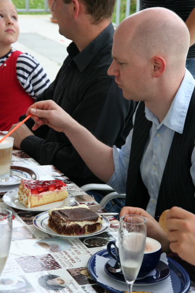 Bei herrlichem Wetter singt der Chor eine Hochzeit mit Taufe im idyllischen Betra. Anschließend gibt es riesige Kuchenstücke im hiesigen Café.